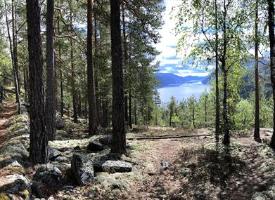 Du vil etterhvert få et skilt til venstre ned til Sandviken Camping. Det er også skiltet til Åsral opp til høyre. Det er veien du vil senere ta nedover, men først følger du den skogsbilvei en liten stykk videre til du se skilt mot "Gamal kyrkjesti" mot høyre. Nå vandrer du på gamle kirkesti nedover. Du krysser to ganger en litt større skogsvei før du kommer ut på den store Skogsbilvei igjen. Der stå det også skilt mot "Gamal Kyrkjesti" og mot venstre til Sandviken Camping. Tar til venstre og følger skogsbilvei oppover og langs med Tinnsjøen. Hold deg mot høyre hele veien opp. Men pass på, der veien deler seg er det litt skjult i skogen, på venstre side, en fin rasteplass. Følg skogsbilvei til du igjen kommer forbi der du tok av til "gamal kykjesti". Går videre til du er tilbake ved krys der du går ned mot Sandviken Camping. Nå følger du denne skogsveien nedover mot Sandviken Camping. Halvveis nedover er det skilt et utsiktspunkt mot høyre inn i skogen. Hvis du ta stien nedover kommer du til den øvre kanten av en klatrefels, der du kan nyte igjen den vakre utsikten over Tinnsjøen, men var forsiktig ved kanten.
