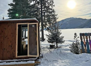 Sandviken Camping ligger idyllisk til ved Tinnsjøen i Tinn Austbygd. Her er det satt opp en koselig sauna rett ved vannkanten.